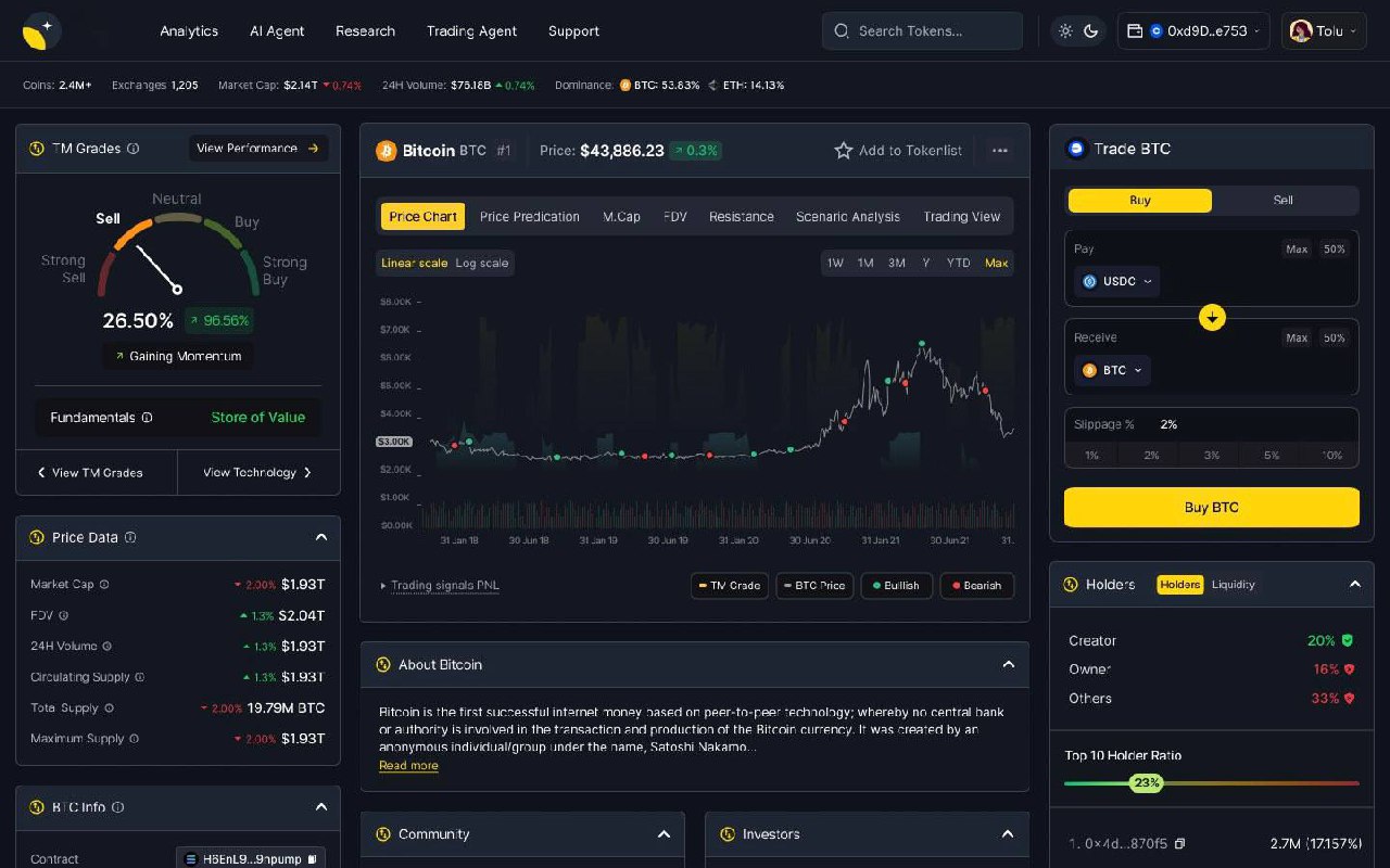 Our AI and Machine Learning algorithms identify potential trends and predict future price movements by considering factors such as Fundamental Reports, Code Quality, Sentiment Analysis, Moving Averages, and Support/Resistance levels, among many others.